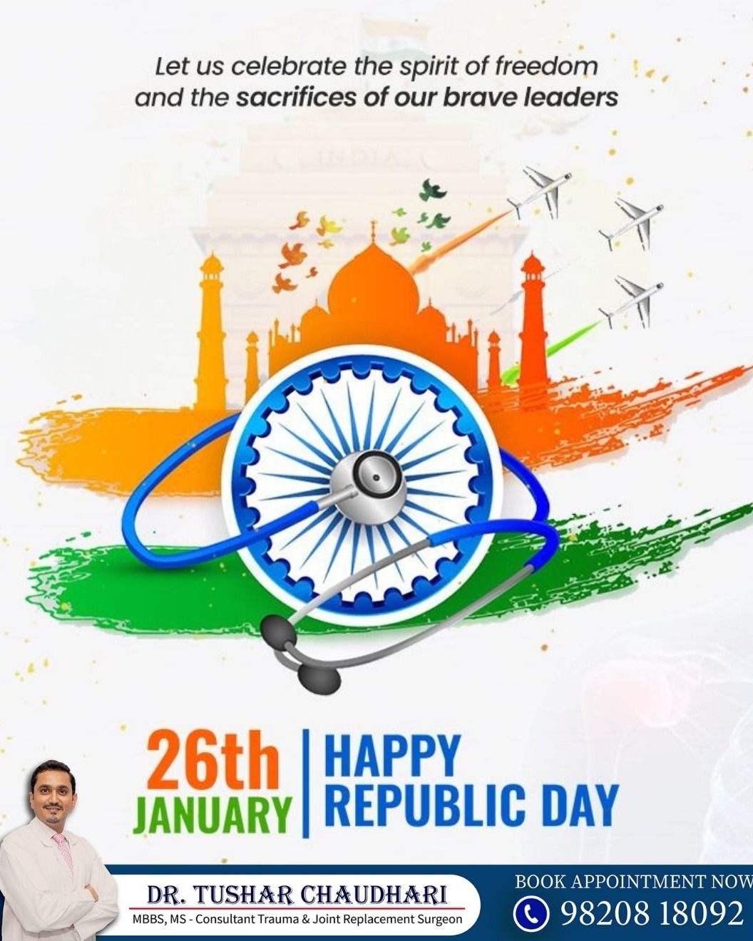 Happy Republic Day. On this special day, let us honour our freedom by choosing health, strength, and an active lifestyle. At Dr Tushar Chaudhari Clinic, we are dedicated to caring for your joints and mobility with expert treatment and compassionate support. Thank you for trusting us with your wellbeing. Together, let us move towards a healthier and more active India.