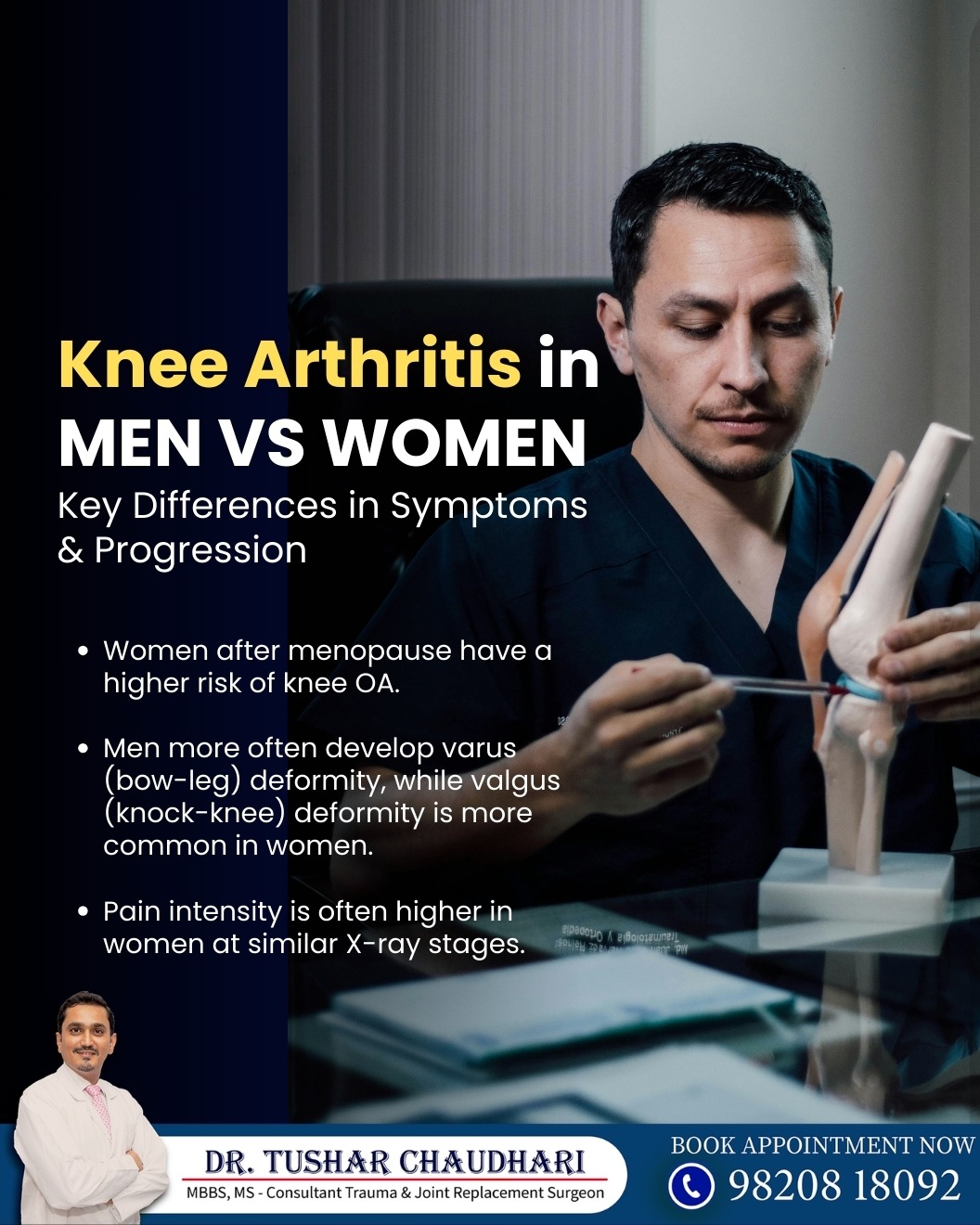 Knee Arthritis in Men vs Women shows important differences in symptoms and progression. Research shows women after menopause have a higher risk of developing knee osteoarthritis (OA) due to hormonal changes and reduced bone strength. On the other hand, men more commonly develop varus deformity (bow-leg), while valgus deformity (knock-knee) is seen more often in women. Studies also suggest that pain intensity in knee arthritis is frequently higher in women, even when the X-ray stage appears similar. Understanding these differences helps doctors plan better knee arthritis treatment, pain management, physiotherapy, and when needed, knee replacement surgery for improved mobility and long-term joint health. If you are looking for a Knee Arthritis specialist in chinchwad, a trusted Knee pain doctor in pcmc, or an experienced Knee replacement surgeon in pune, expert orthopedic evaluation and personalized treatment can help manage pain and improve joint function effectively. 📞 Book Your Appointment Today! Visit: www.drtusharchaudhari.com Call or WhatsApp on 9820818092 #kneearthritis #kneepain #osteoarthritis #jointpain #kneecare #orthopediccare #kneejointhealth #mobilitymatters #jointhealth #painmanagement