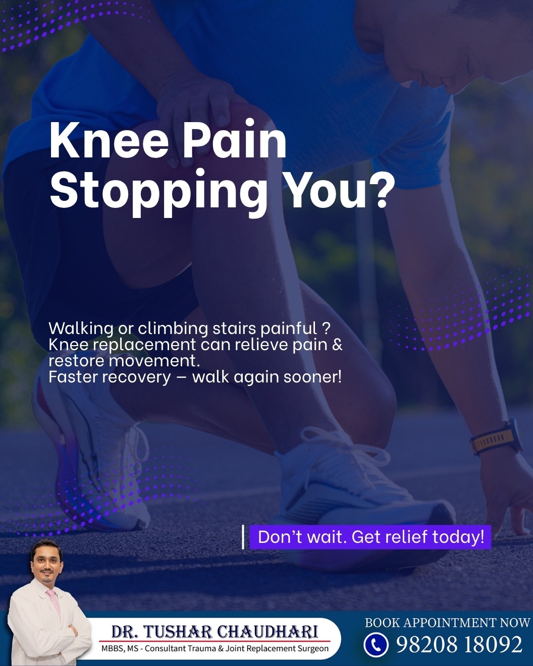 Knee pain stopping you from enjoying daily life? Walking, climbing stairs, or even standing for long can become difficult with chronic knee pain. Knee replacement is an advanced solution that helps relieve pain, restore joint function, and improve mobility. With modern techniques, patients experience faster recovery, reduced discomfort, and can walk again sooner with confidence. Donโt let knee pain limit your lifestyle timely treatment can help you regain independence and live pain-free. Consult a specialist to understand if knee replacement is the right option for you and take the first step towards better movement. For knee replacement in PCMC, Chinchwad, Pune, consult an experienced knee specialist for advanced treatment and faster recovery. Expert care ensures accurate diagnosis, effective pain relief, and improved mobility so you can return to your active lifestyle without limitations. ๐ Book Your Appointment Today! Visit: www.drtusharchaudhari.com Call or WhatsApp on 9820818092 #kneepain #kneereplacement #jointpain #orthopedics #painrelief #mobility #healthcare