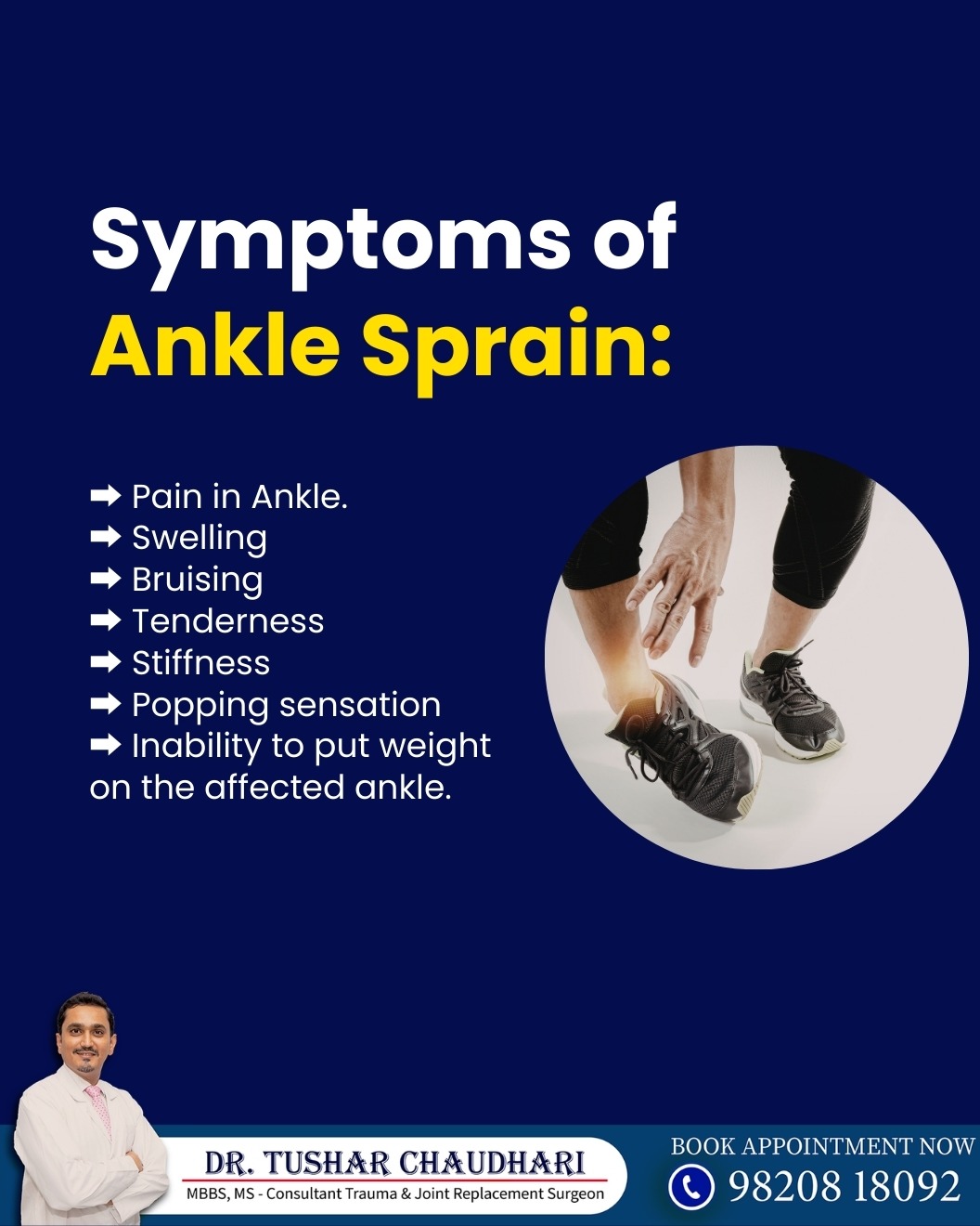 Symptoms of ankle sprain should never be ignored. Common signs include pain in ankle, swelling, bruising, tenderness, stiffness, and sometimes a popping sensation at the time of injury. You may also feel difficulty or inability to put weight on the affected ankle. An ankle sprain occurs when ligaments are stretched or torn due to sudden twisting or impact. Ignoring these symptoms can worsen the injury and delay healing. Early care with proper rest, support, and medical evaluation helps reduce pain, restore stability, and prevent long-term complications. Timely treatment ensures faster recovery and safe return to daily activities. For proper ankle sprain treatment in pune, consult a trusted orthopedic doctor in pune or visit a sports injury clinic in pune. Early diagnosis and expert care help manage pain, reduce swelling, and ensure faster healing with improved ankle stability and function. 📞 Book Your Appointment Today! Visit: www.drtusharchaudhari.com Call or WhatsApp on 9820818092 #anklesprain #anklepain #sportsinjury #ligamentinjury #painrelief #injurycare #physiotherapy #healthtips